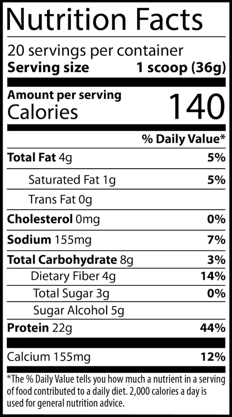 | Serving Size: 1 Large Scoop (36 g) | Servings Per Container: 20 |
