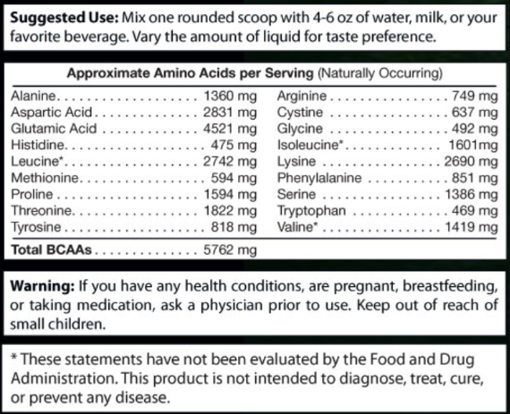 Total BCAAs Per Serving: 5762 mg (Naturally Occurring)